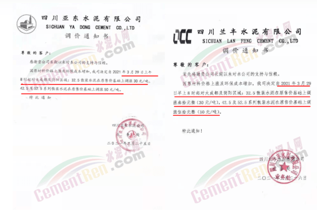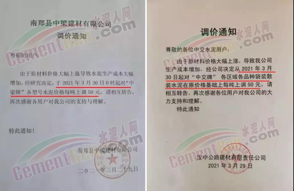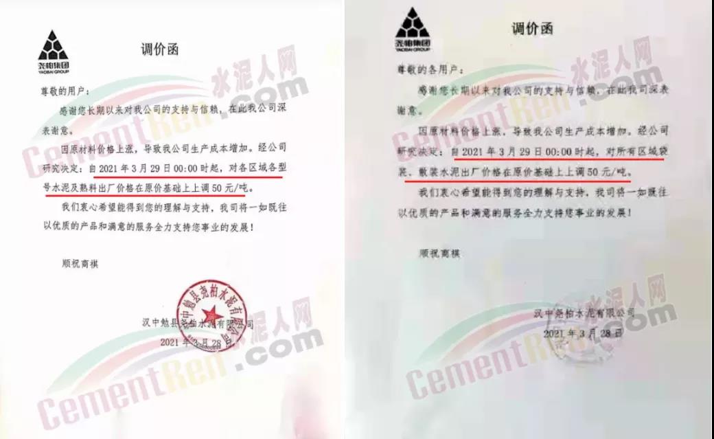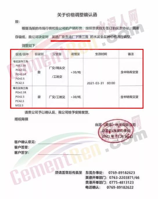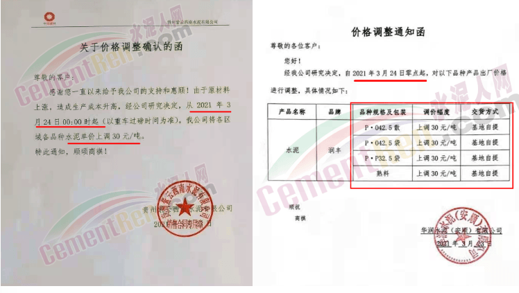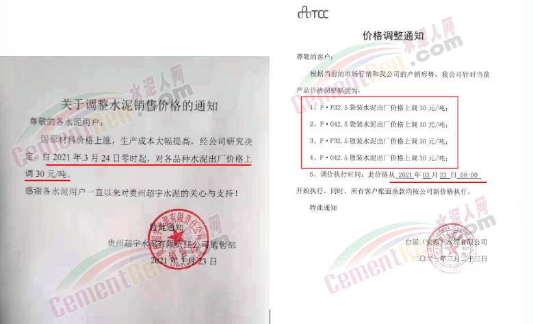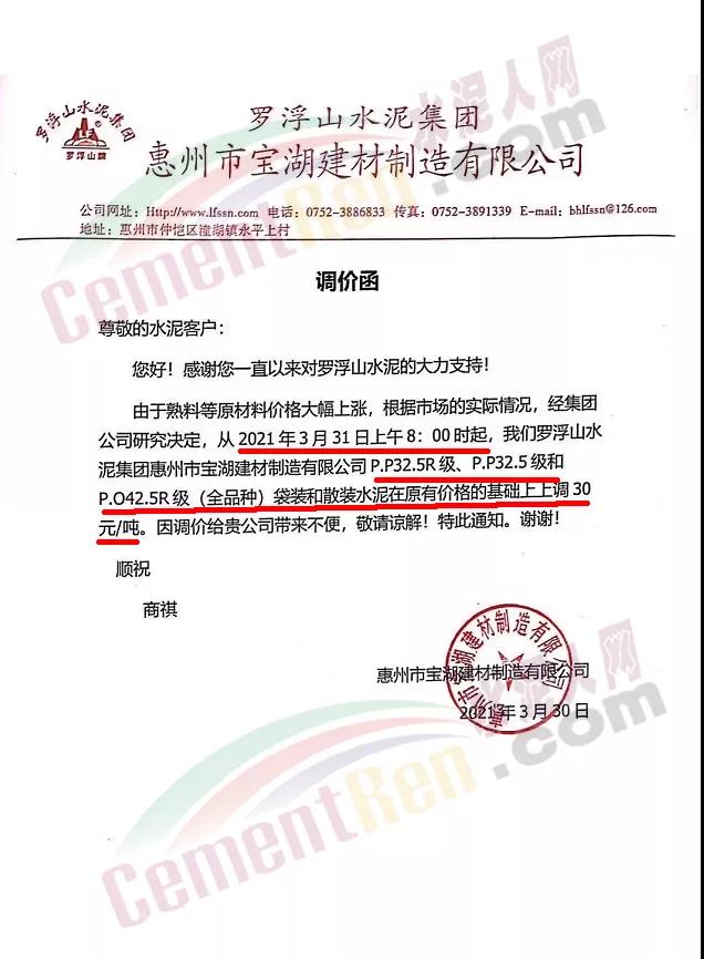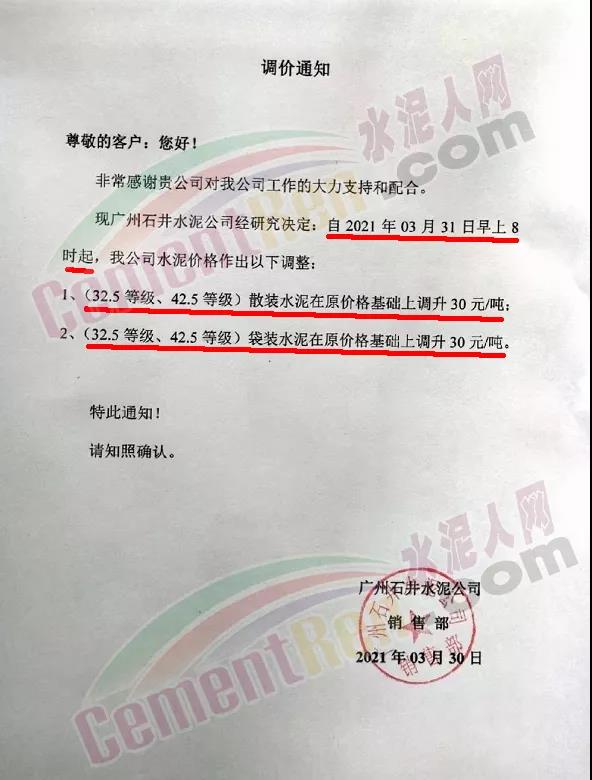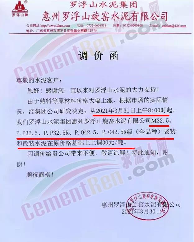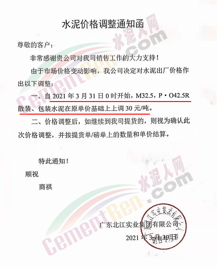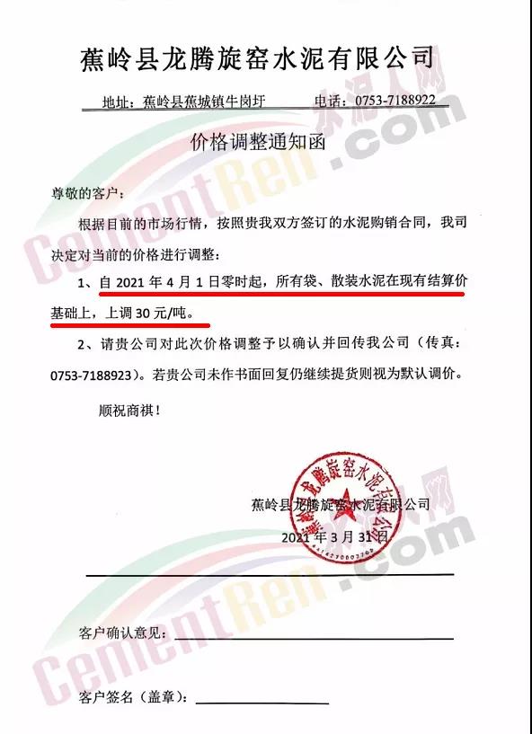 由于原燃材料大幅度上漲,經(jīng)我司研究決定,從2021年04月1日起,我司發(fā)往廣東省的各品牌、各品種規(guī)格袋裝、散裝水泥出廠單價在原價格基礎(chǔ)上每噸上調(diào)30元。熟料出廠單價在原價格基礎(chǔ)上每噸上調(diào)20元。不便之處,敬請見諒。