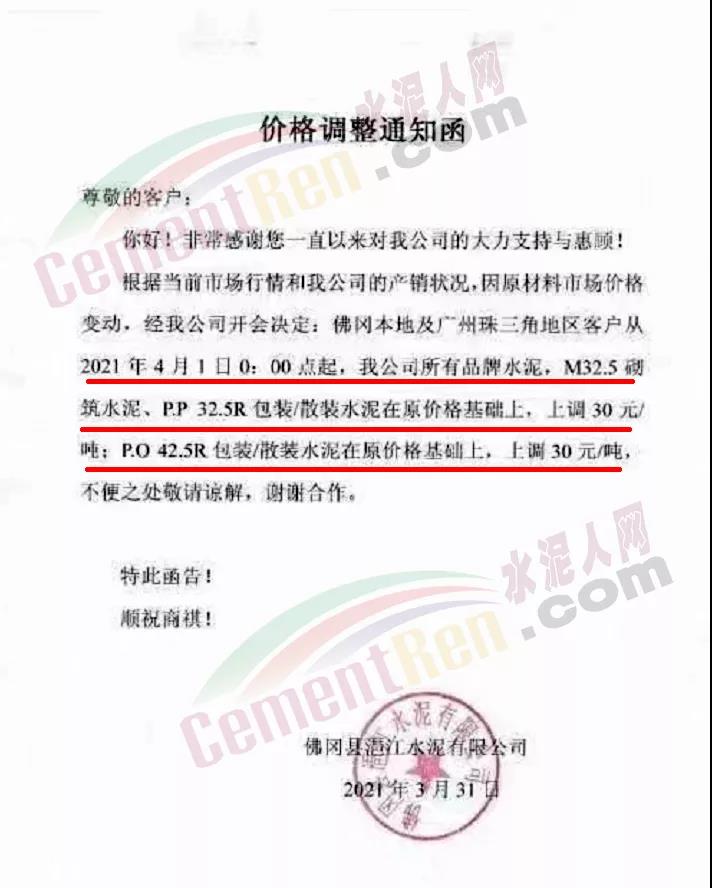 佛岡縣潖江水泥有限公司通知,從4月1日零點(diǎn)起,公司所有品牌水泥包裝/散裝上調(diào)30元/噸。