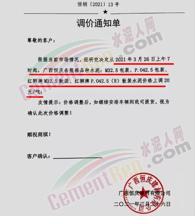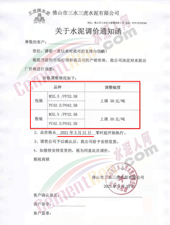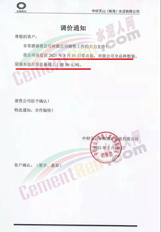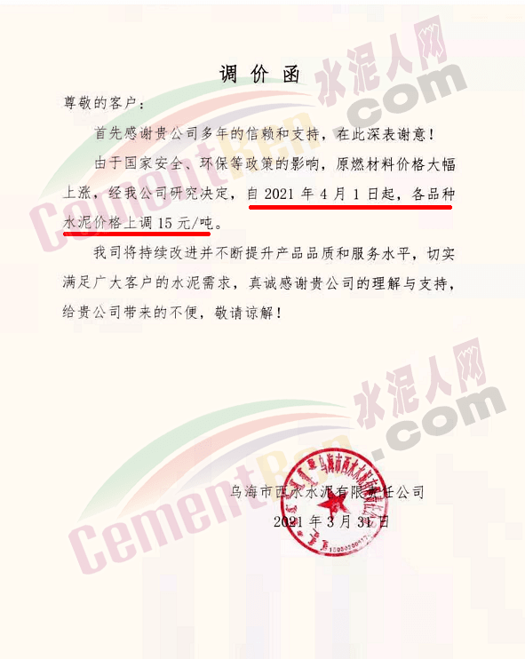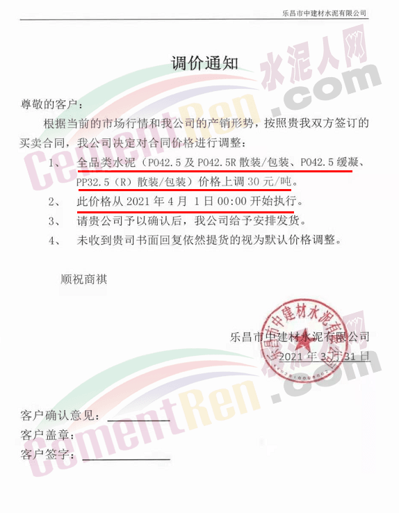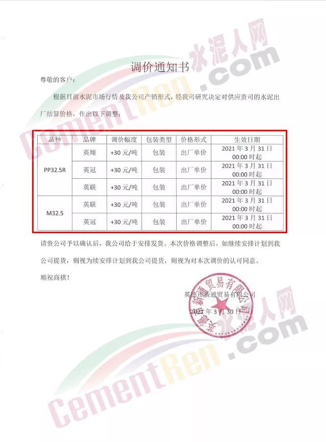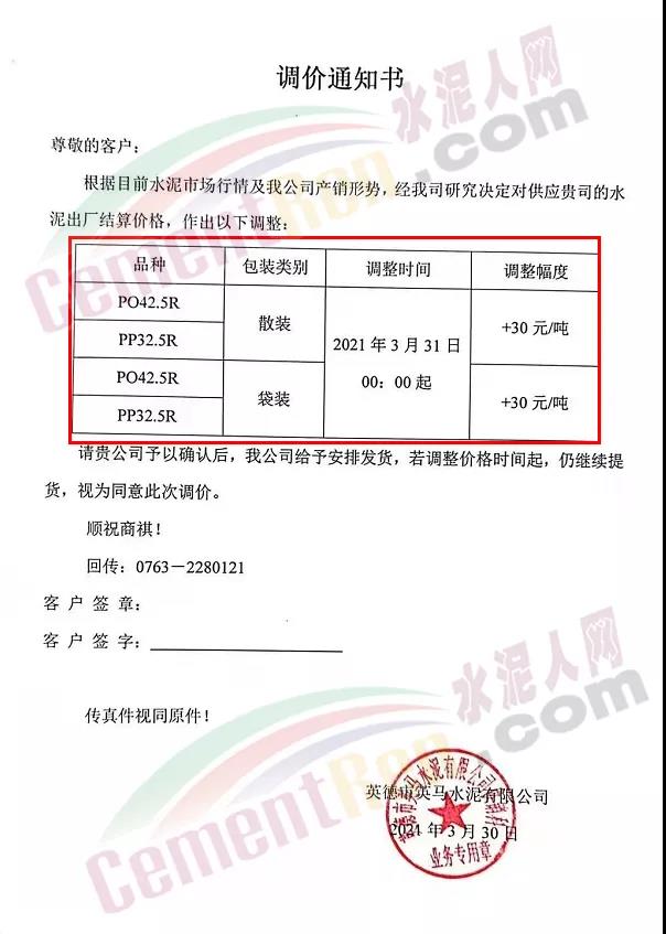感謝您長期以來對我公司產(chǎn)品的信任和支持。因生產(chǎn)成本增加,庫存緊張,經(jīng)我公司研究決定:為了確保持續(xù)向客戶保質(zhì)保量提供優(yōu)質(zhì)產(chǎn)品,自2021年3月31日早8點(diǎn)開始對我公司產(chǎn)品價格做出如下調(diào)整:P.O42.5等級水泥產(chǎn)品在原價基礎(chǔ)上上調(diào)30元/噸。我公司將以微信或短信形式發(fā)送調(diào)價通知,如貴公司繼續(xù)提貨則視為同意接受新價格。