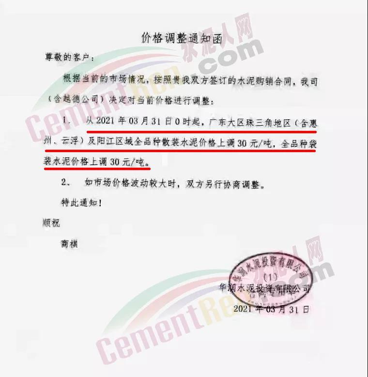 華潤水泥投資有限公司通知,自3月31日0時起,廣東珠三角地區(qū)(含惠州、云?。┘瓣柦珔^(qū)域全品種袋裝和散裝水泥價格上調(diào)30元/噸。