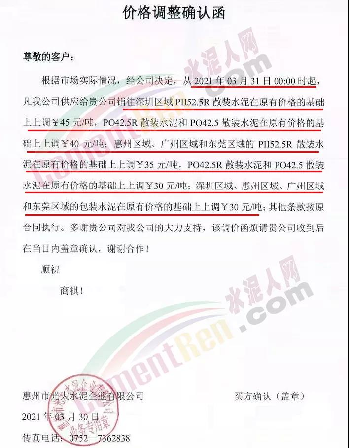 惠州市光大水泥企業(yè)有限公司通知從2021年3月31日零時起: