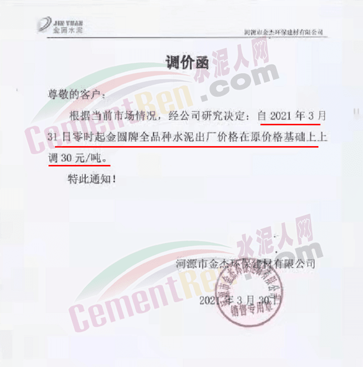 河源市金杰環(huán)保建材有限公司通知,自3月31日零時起金圓牌全品牌水泥出廠價上調(diào)30元/噸。