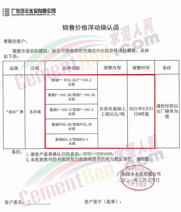 廣東鴻豐水泥有限公司通知自3月31日0時起,上調(diào)各標(biāo)號水泥價格30元/噸。