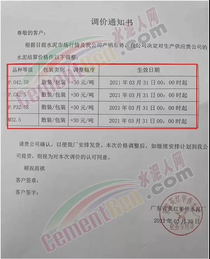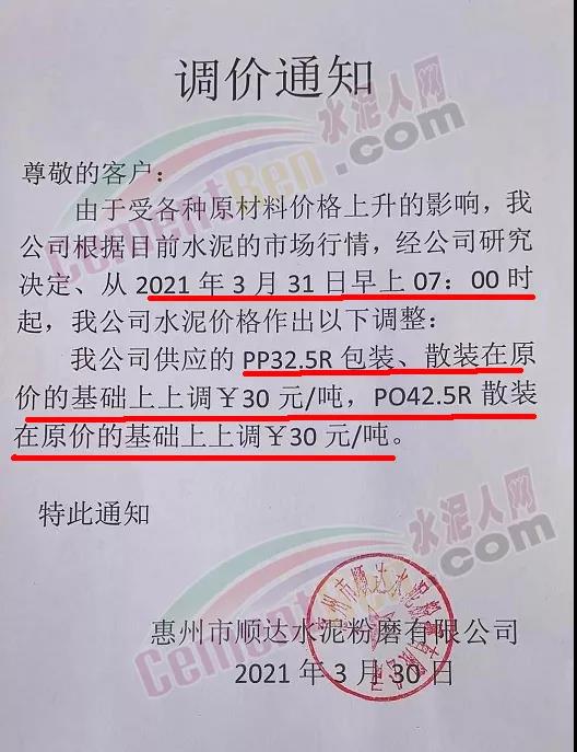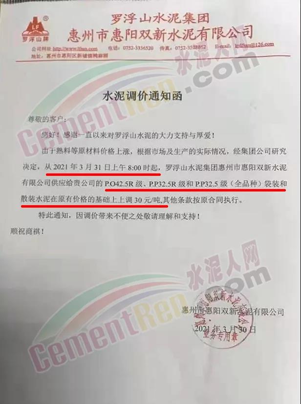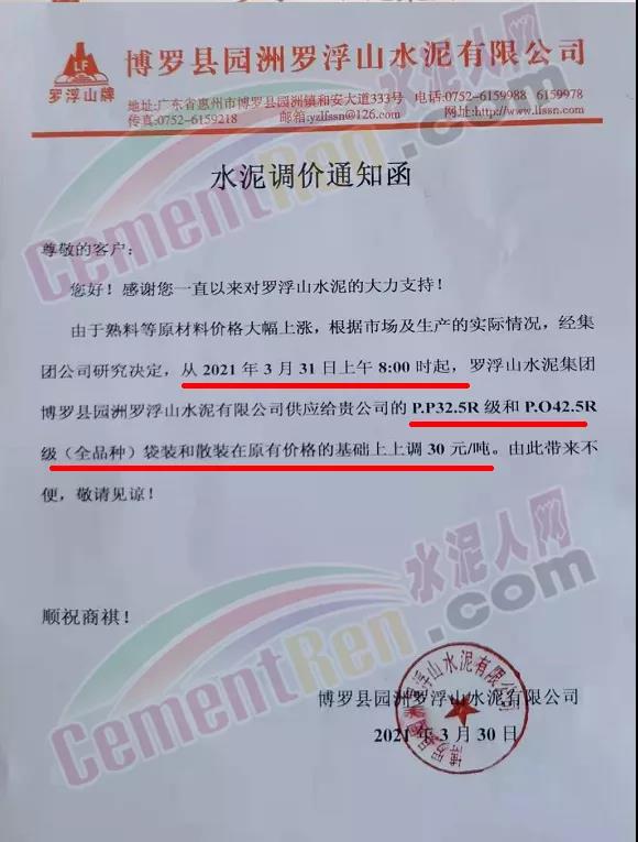梅州皇馬水泥有限公司通知從4月1日零時起,所有品種等級水泥出廠價上調(diào)30元/噸。
