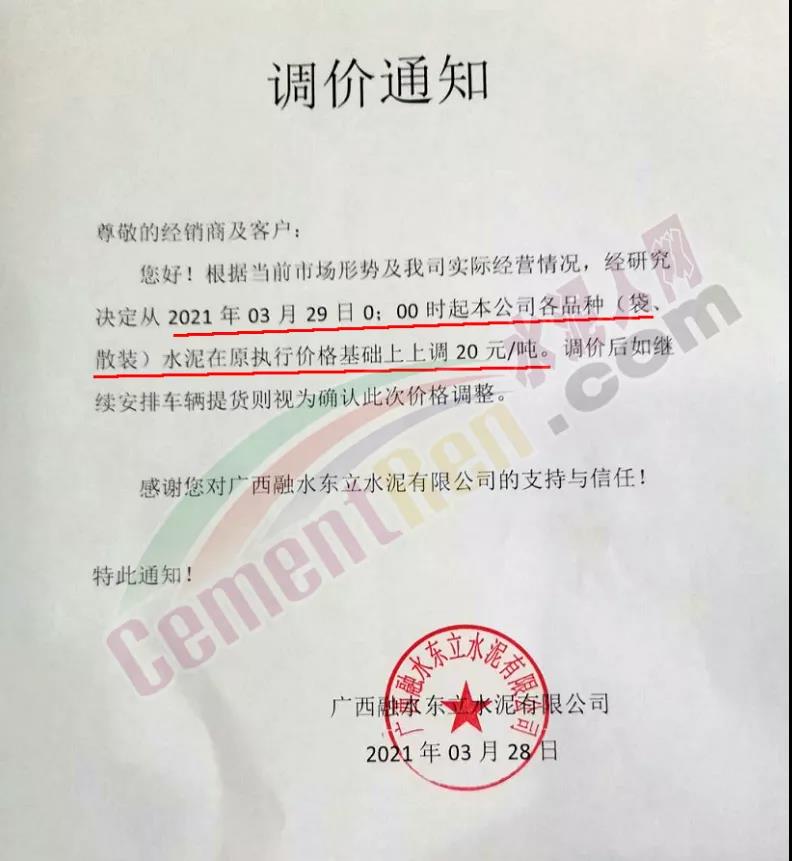 廣西融水東立水泥有限公司通知自3月29日0時起各品種水泥在原執(zhí)行價格基礎(chǔ)上上調(diào)20元/噸。