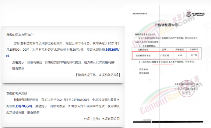 據(jù)了解,日前廣西壯族自治區(qū)華潤、臺泥、路寶水泥等分別通知自3月25日起各品種水泥價格上調(diào)20元/噸。