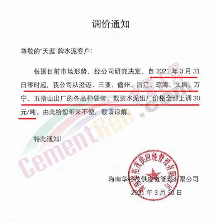 海南華裕茂供應(yīng)鏈管理有限公司通知自3月31日零時起,公司從澄邁、三亞、儋州、昌江、瓊海、文昌、萬寧、五指山出廠的各品種袋裝、散裝水泥出廠價全部上調(diào)30元/噸。