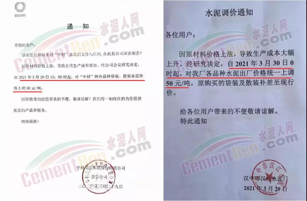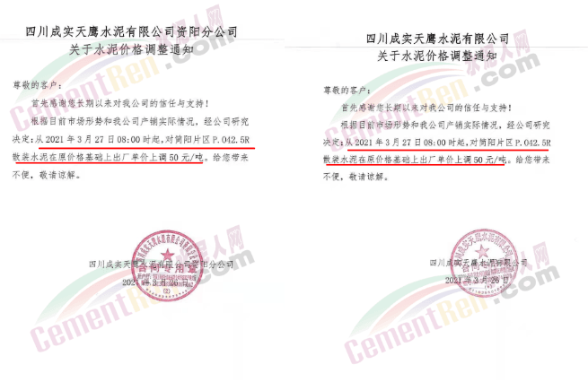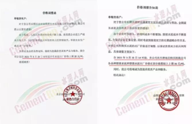 根據(jù)當(dāng)前市場行情,我公司于2021年3月26日8:00時,對M32.5級袋裝水泥上調(diào)20元/噸,對PO42.5級袋裝水泥價格上調(diào)30元/噸,特此通知!
