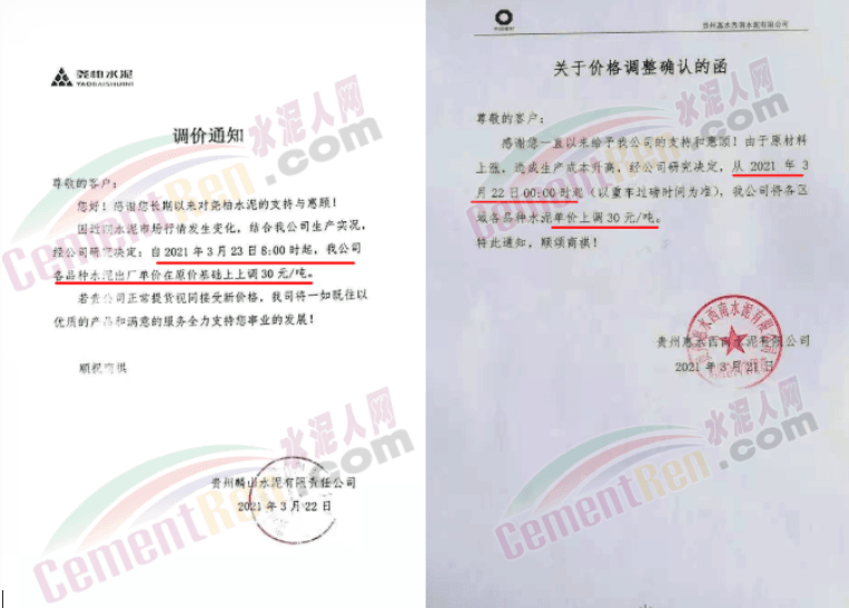3月下旬貴州紫云西南水泥、惠水西南、華潤水泥(安順)公司、臺泥(安順)公司、貴州超宇水泥、貴州麟山水泥通知上調(diào)水泥價格30元/噸。