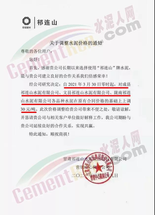 甘肅祁連山水泥集團(tuán)有限公司營銷中心隴南公司通知,自3月30日零時起,對成縣祁連山水泥、文縣祁連山水泥、隴南祁連山水泥各品種水泥在原合同價格的基礎(chǔ)上調(diào)30元/噸。