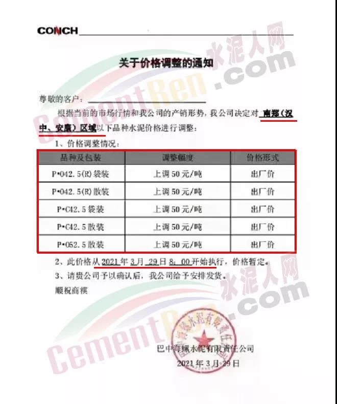 巴中海螺水泥有限責(zé)任公司通知,自3月29日起對南效(漢中、安康)區(qū)域高標(biāo)號水泥出廠價上調(diào)50元/噸。
