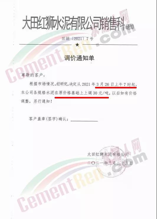 3月25日大田紅獅水泥通知自3月26日上午7時起,各規(guī)格水泥上調(diào)30元/噸。