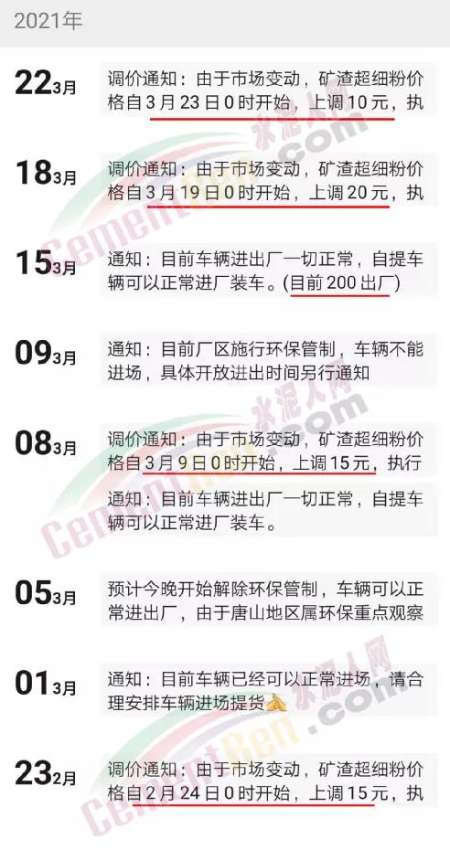 以唐山地區(qū)為例,礦渣細(xì)粉價格已經(jīng)連續(xù)四輪上漲,累計上調(diào)60元/噸。從唐山區(qū)域某礦粉經(jīng)銷售商近一個月的通知可見礦粉供應(yīng)日趨緊從2月下旬就開始了,目前的執(zhí)行價格已經(jīng)突破200元/噸。