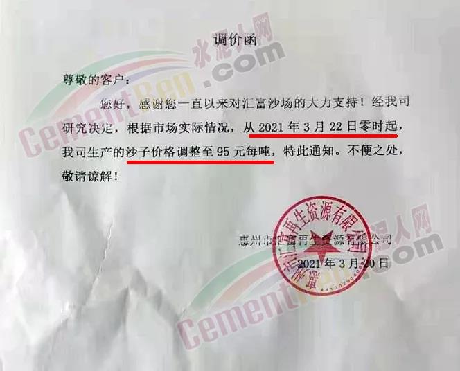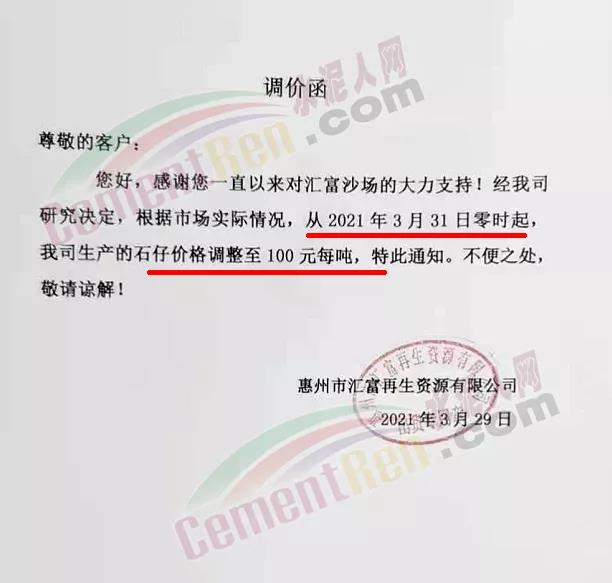 日前惠州市匯富再生資源有限公司通知,根據(jù)市場實(shí)際情況從4月3日零時起,公司生產(chǎn)的沙子價格調(diào)整至100元/噸。據(jù)了解,3月20日企業(yè)發(fā)布的調(diào)價函稱,沙子價格調(diào)整至95元/噸。同期,企業(yè)發(fā)布調(diào)價通知稱,3月31日零時起公司生產(chǎn)的石子價格調(diào)整至100元/噸。