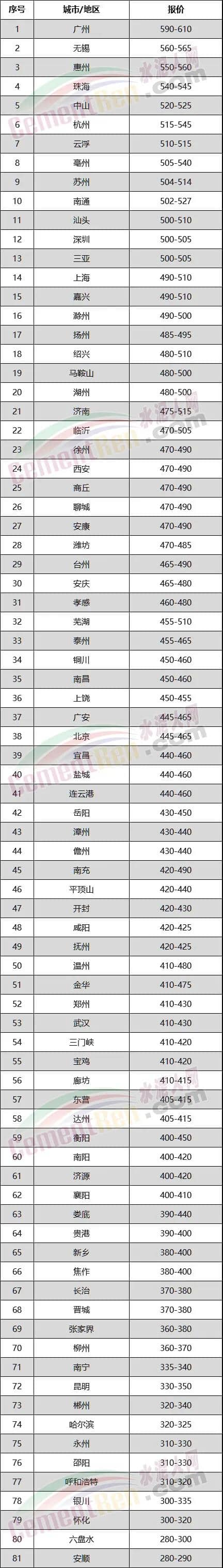 銷往深圳區(qū)域PII52.5R散裝水泥在原有價格的基礎(chǔ)上上調(diào)45 元/噸,PO42.5R散裝水泥和PO42.5散裝水泥在原有價格的基礎(chǔ)上上調(diào)40 元/噸;