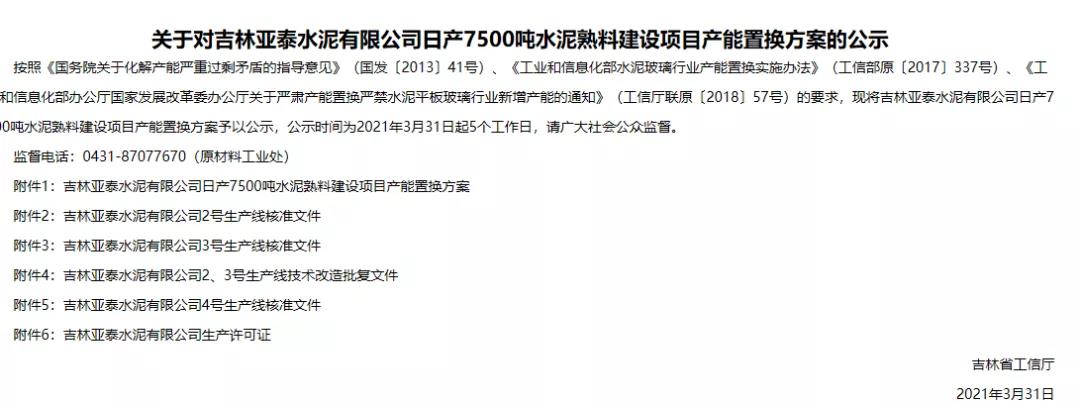 3月31日吉林省工信廳發(fā)布《關(guān)于對(duì)吉林亞泰水泥有限公司日產(chǎn)7500噸水泥熟料建設(shè)項(xiàng)目產(chǎn)能置換方案的公示》稱,按照相關(guān)文件要求,將吉林亞泰水泥有限公司7500t/d水泥熟料建設(shè)項(xiàng)目產(chǎn)能置換方案予以公示,公示時(shí)間為2021年3月31日起5個(gè)工作日。