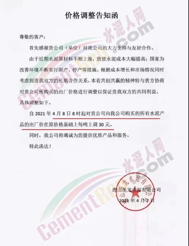 唐山圣龍水泥有限公司通知,由于近期水泥原材料不斷上漲,致使水泥成本大幅提高,自 4月8日8時(shí)所有水泥產(chǎn)品的出廠價(jià)在原價(jià)格基礎(chǔ)上上調(diào)30元/噸。