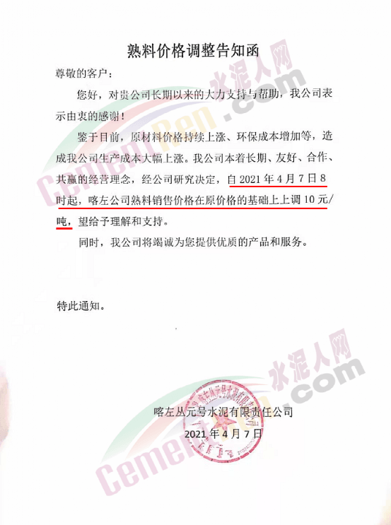 遼寧喀左叢元號(hào)水泥熟料價(jià)格調(diào)整告知函稱,鑒于目前,原材料價(jià)格持續(xù)上漲、環(huán)保成本增加等,造成公司生產(chǎn)成本大幅上漲。自4月7日8時(shí)起,喀左公司熟料銷(xiāo)售價(jià)格在原價(jià)格的基礎(chǔ)上上調(diào)10 元/噸。