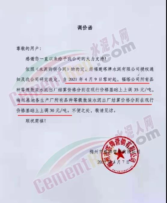 福州市塔牌營(yíng)銷(xiāo)公司通知自4 月9日零時(shí)起,福塔公司所有品種等級(jí)散裝水泥出廠結(jié)算價(jià)格分別在現(xiàn)行價(jià)格基礎(chǔ)上上調(diào) 35 元/噸,梅州基地各生產(chǎn)廠所有品種等級(jí)散裝水泥出廠結(jié)算價(jià)格分別在現(xiàn)行價(jià)格基礎(chǔ)上上調(diào) 30 元/噸。據(jù)水泥人網(wǎng)通訊反饋近期該企業(yè)已連續(xù)多次上調(diào)水泥價(jià)格,累計(jì)漲幅近100元/噸。