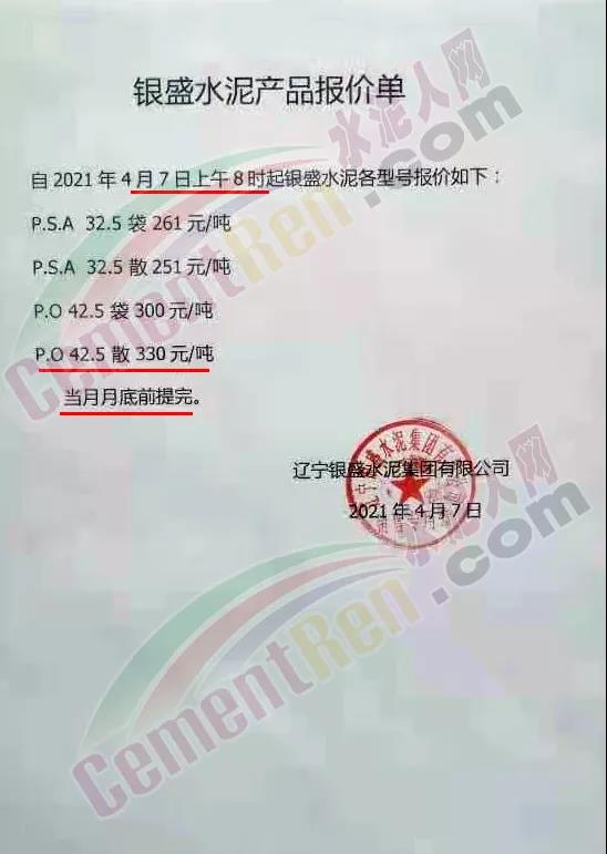 遼寧銀盛通知自4月7日上午8時(shí)起各型號(hào)執(zhí)行最新報(bào)告,其中P.O42.5散裝水泥報(bào)價(jià)330元/噸。且要求當(dāng)月月底前提完。據(jù)水泥人網(wǎng)通訊員反饋,當(dāng)日銀盛水泥廠門(mén)前出現(xiàn)了水泥車(chē)排隊(duì)提貨現(xiàn)象。