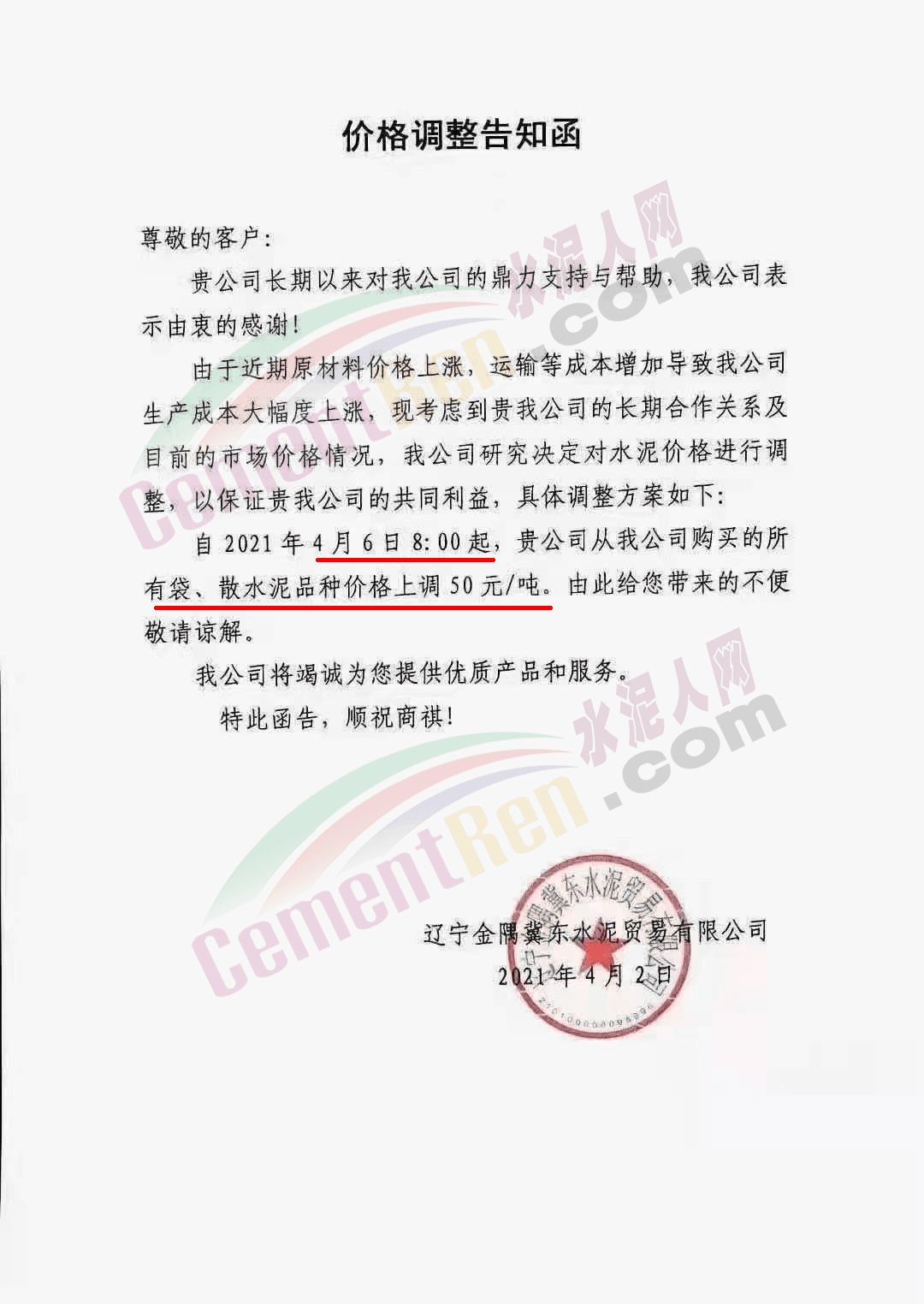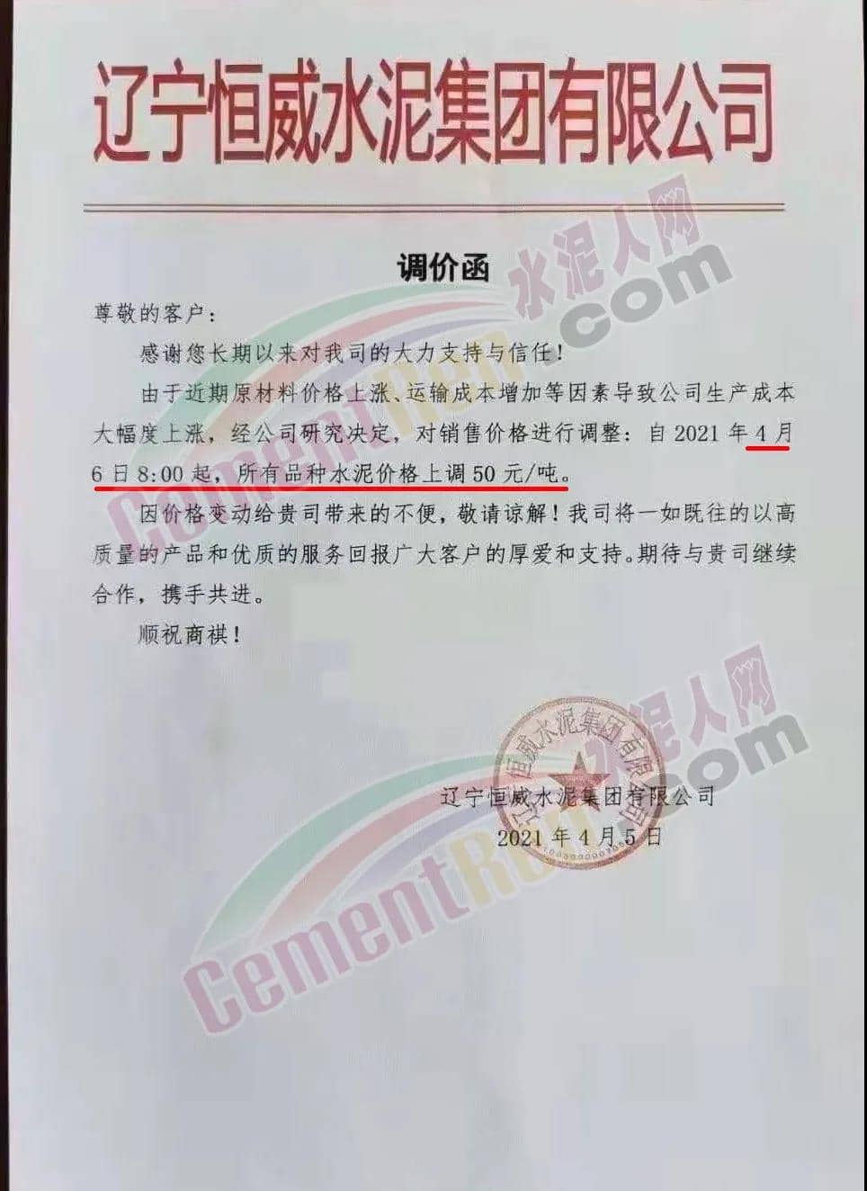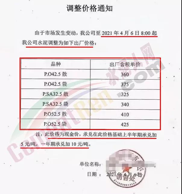 河北承大環(huán)保科技有限公司調(diào)價(jià)告知函稱,隨著京津冀地區(qū)的環(huán)保治理力度持續(xù)加大,同時(shí)受錯(cuò)峰停產(chǎn)、礦山、道路運(yùn)輸治理力度加大、企業(yè)環(huán)保投入不斷增加,原燃材料價(jià)格大幅上漲,企業(yè)生產(chǎn)成本大幅上升。自 2021年4 月8日早7時(shí)起所有水泥產(chǎn)品在原價(jià)基礎(chǔ)上上調(diào) 50 元/噸。