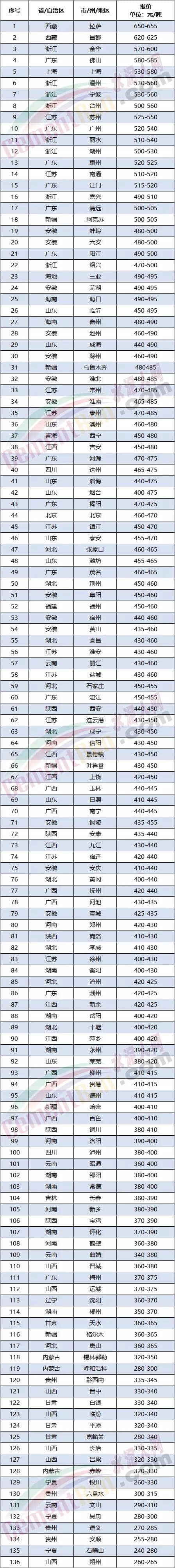 從水泥人網(wǎng)重點(diǎn)監(jiān)控的100多個(gè)區(qū)域報(bào)價(jià)來(lái)看各區(qū)域均價(jià)約在418.65~442.72元/噸之間,在400~500元/噸價(jià)格區(qū)間的區(qū)域約占60%以上。最高價(jià)仍在西藏高原地區(qū),昌都區(qū)域PO42.5散裝水泥報(bào)價(jià)達(dá)到620-625元/噸,處于第二位的是長(zhǎng)三角區(qū)域和珠三角區(qū)域,浙江金華報(bào)價(jià)已超600元/噸,廣東佛山目前報(bào)價(jià)與600元/噸也只差一張20元/噸的“漲價(jià)函”。從目前的行情趨勢(shì)來(lái)看,達(dá)到600元/噸也是指日可待。