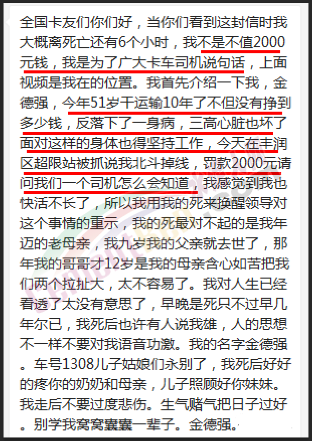 網(wǎng)傳的金德強(qiáng)臨走前留下的”遺言“在卡友群里瘋轉(zhuǎn),他在遺書中寫道,自己今年51歲,從事貨運(yùn)行業(yè)十年,沒(méi)賺到錢反而落下一身病,北斗掉線自己無(wú)法查知,希望用自己的死喚起領(lǐng)導(dǎo)對(duì)這個(gè)事情的重視。在他的字里行間能看得出這不是偶然的情緒崩潰,而是遇到了壓死他的最后一根稻草。