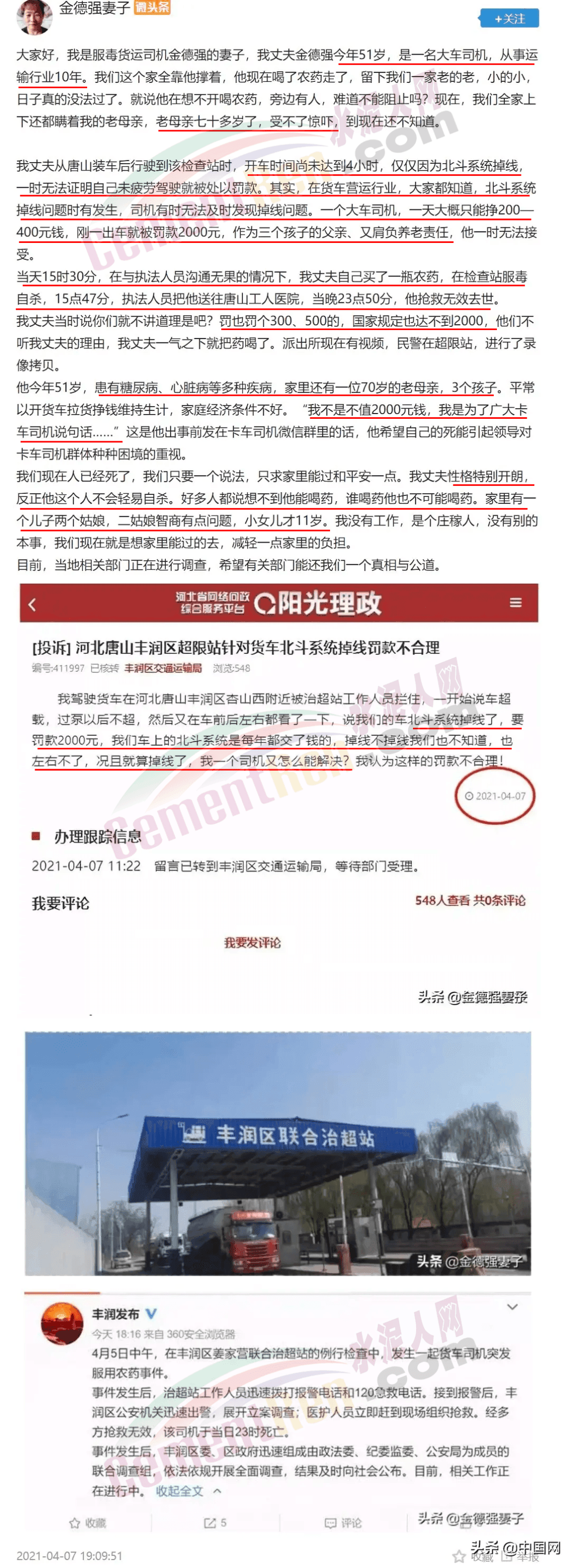 4月7日,服毒卡車司機(jī)金德強(qiáng)的妻子發(fā)聲:現(xiàn)在全家上下還都瞞著老母親,老母親七十多歲了,受不了驚嚇,到現(xiàn)在還不知道。目前,當(dāng)?shù)叵嚓P(guān)部門正在進(jìn)行調(diào)查,希望有關(guān)部門能還一個(gè)真相與公道。