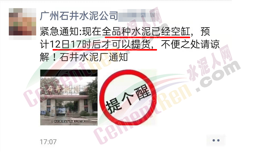 水泥人網(wǎng)通訊員消息:昨日(4月11日)傍晚17時(shí)左右,廣州石井水泥公司發(fā)出緊急通知,“全品種水泥已經(jīng)空缸,預(yù)計(jì)一天后(12日17時(shí))才能提貨。”