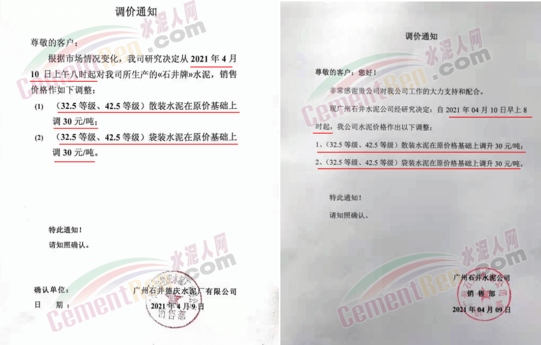 羅浮山水水泥集團(tuán)惠州國(guó)強(qiáng)水泥有限公司、博羅縣浮山水泥有限公司、惠州羅浮山旋窯水泥有限公司、惠州寶湖建材制造有限公司、惠州市惠陽(yáng)雙新水泥有限公司等多家企業(yè)陸續(xù)通知上調(diào)各標(biāo)號(hào)水泥價(jià)格30元/噸。部分企業(yè)調(diào)價(jià)通知如下: