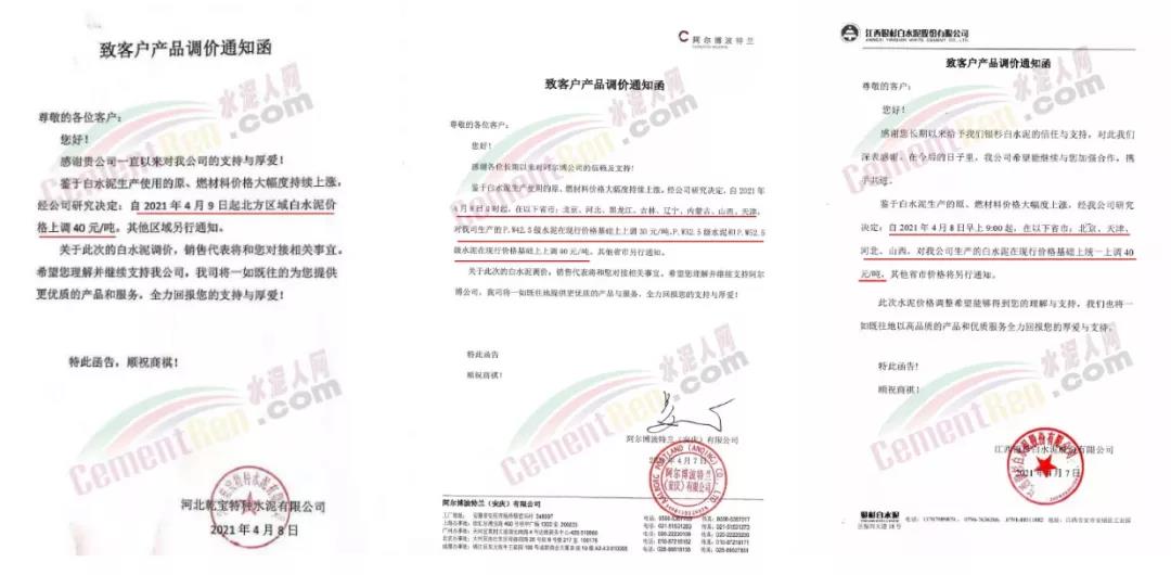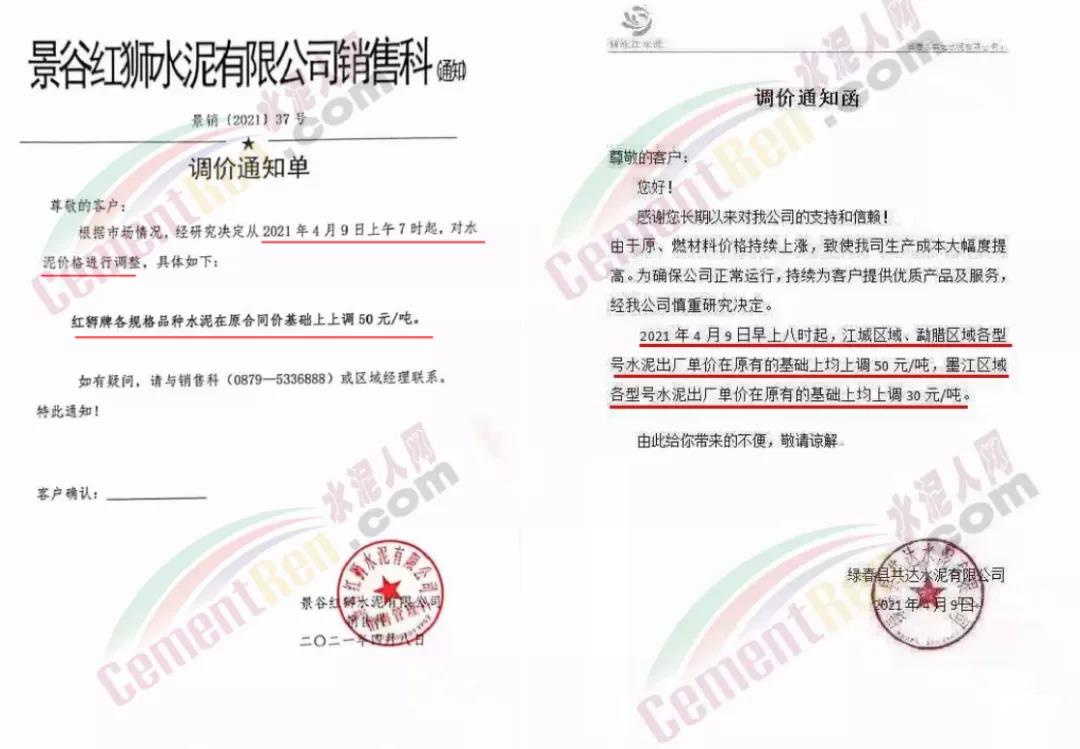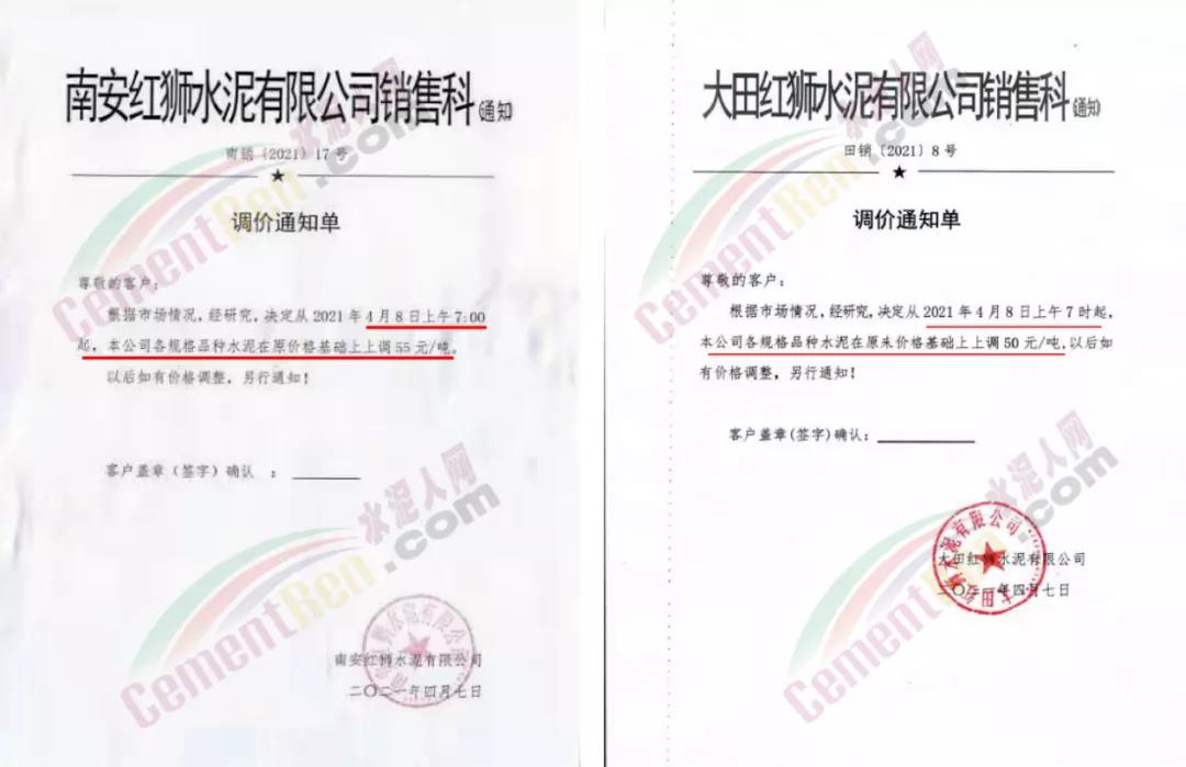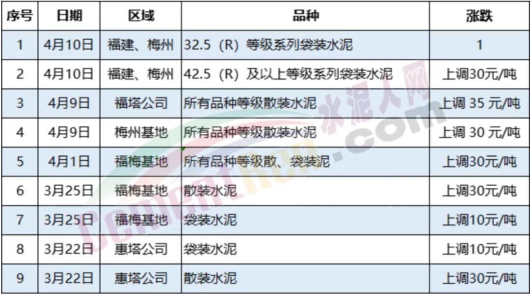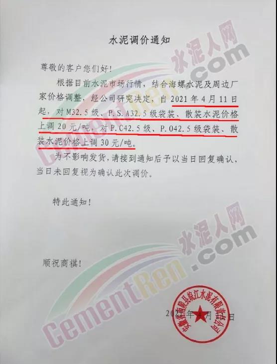 福建水泥股份有限公司南平南銷售區(qū)域通知,自4月9日起,公司各生產(chǎn)基地發(fā)往南平南區(qū)域各品種、袋散裝水泥的出廠含稅價(jià),在原有價(jià)格基礎(chǔ)上上調(diào)40元/噸。