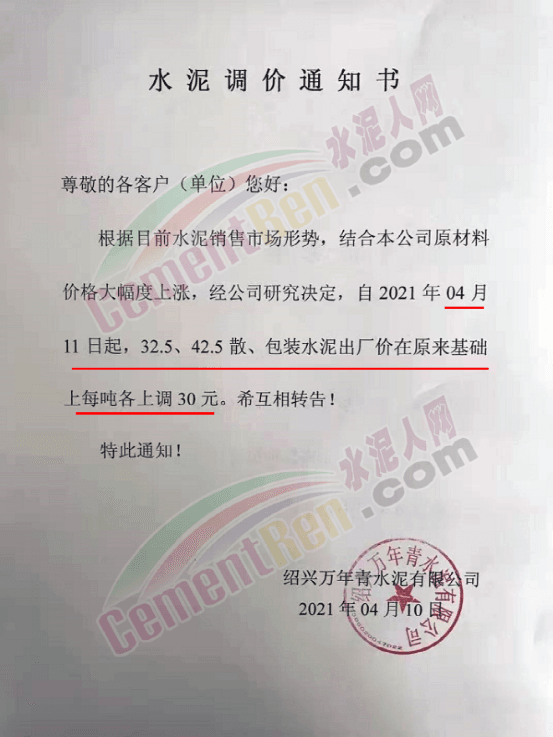 4月10日,紹興萬年青水泥有限公司通知根據(jù)目前水泥銷售市場(chǎng)形勢(shì),結(jié)合本公司原材料價(jià)格大幅度上漲,經(jīng)公司研究決定,自4月11日起,32.5、42.5散、包裝水泥出廠價(jià)在原來基礎(chǔ)上每噸各上調(diào)30元。