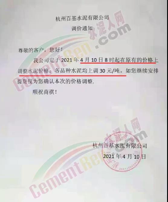 4月10日,杭州百基水泥有限公司通知自4月10日8時(shí)起各品種水泥價(jià)格在原有價(jià)格上調(diào)30元/噸。