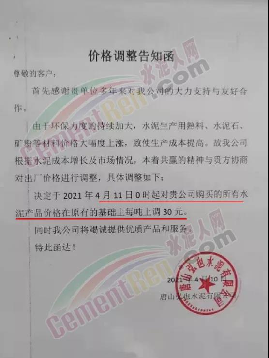 4月10日,唐山弘也水泥有限公司通知由于環(huán)保力度的持續(xù)加大,水泥生產(chǎn)用熟料、水泥石、礦粉等材料價(jià)格大幅度上漲,致使生產(chǎn)成本提高。故公司根據(jù)水泥成本增長(zhǎng)及市場(chǎng)情況,自4月11日0時(shí)起所有水泥產(chǎn)品價(jià)格在原有的基礎(chǔ)上每噸上調(diào)30元。
