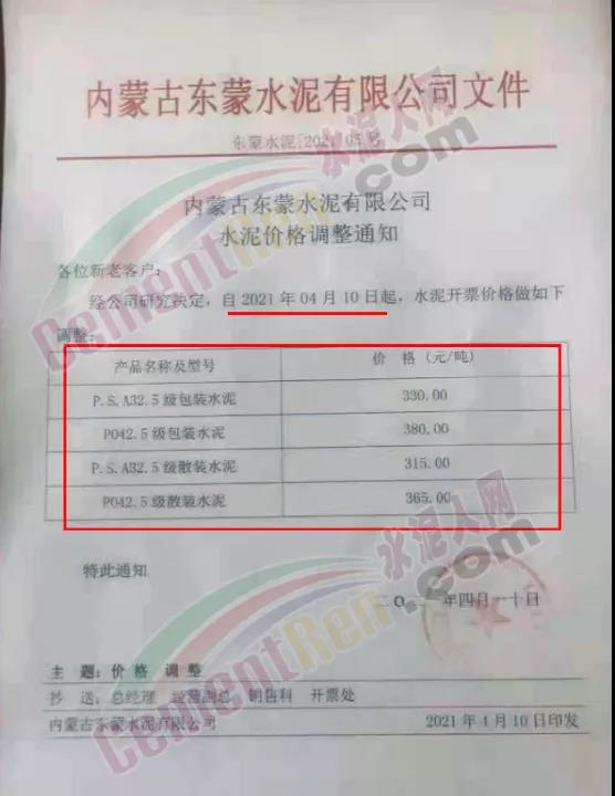 4月10日內(nèi)蒙古東蒙水泥有限公司通知自4月10日起執(zhí)行新的開票價(jià)格,其中PO42.5散裝水泥報(bào)價(jià)365元/噸。