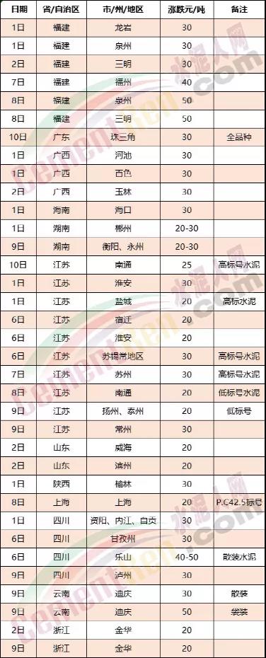 中材天山珠海、云浮、中材亨達(dá)、中材羅定、惠州市光大、惠州固力、惠州市合通建材粉磨公司、梅州皇馬水泥、廣州石井德慶水泥、廣州石井水泥等主要品牌企業(yè)通知水泥在原價(jià)基礎(chǔ)上上調(diào)30元/噸。