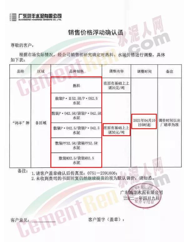 廣東鴻豐水泥有限公司通知自4月10日起熟料價(jià)格在原有基礎(chǔ)上上調(diào)20元/噸,各標(biāo)號(hào)水泥在原有基礎(chǔ)上上調(diào)30元/噸。