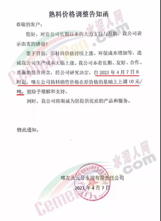遼寧喀左叢元號(hào)通知自4月7日起,公司熟料銷售價(jià)格在原價(jià)格的基礎(chǔ)上上調(diào)10元/噸。