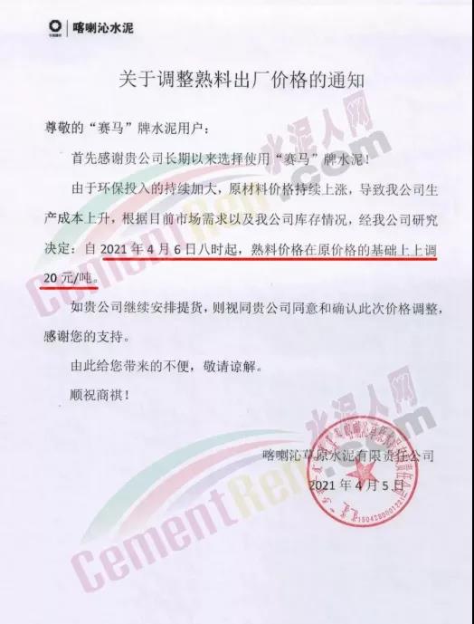 寧夏吳忠賽馬新型建材有限公司通知,自4月6日起,公司各品種規(guī)格水泥在原基礎(chǔ)上上調(diào)20元/噸。