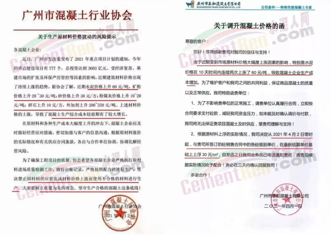 與此同時(shí),廣州市泰和混凝土有限公司、廣東東方混凝生有限公司、廣州市豐成混凝土有限公司、廣東永泰混凝有限公司、廣東宏暉混凝土有限公司等混凝土企業(yè)自4月2日起陸續(xù)通知上調(diào)商品混凝土價(jià)格30~35元/方。