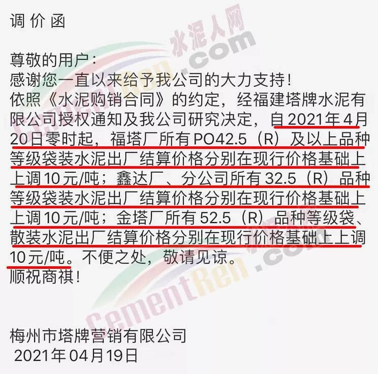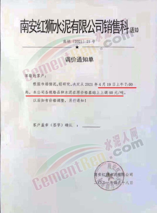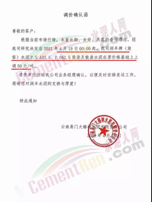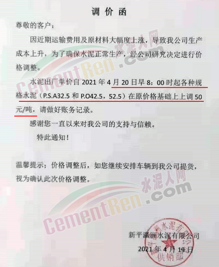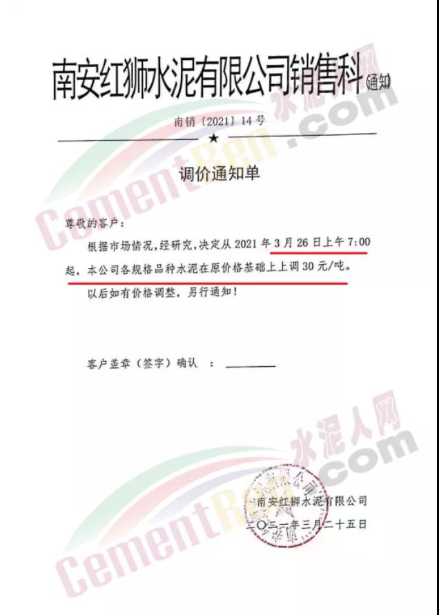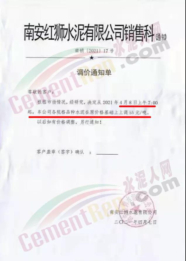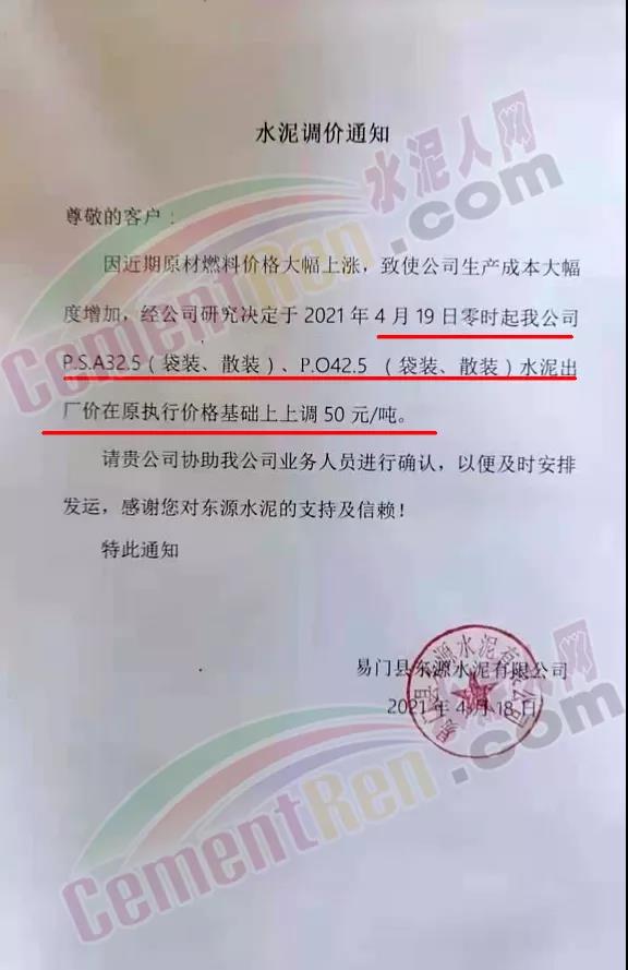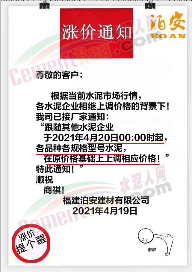 福建泊安建材通知,根據(jù)當(dāng)前水泥市場(chǎng)行情,各水泥企業(yè)相繼上調(diào)價(jià)格的背景下,公司已接廠家通知∶“跟隨其他水泥企業(yè)于2021年4月20日0時(shí)起,各品種各規(guī)格型號(hào)水泥,在原價(jià)格基礎(chǔ)上上調(diào)相應(yīng)價(jià)格!”