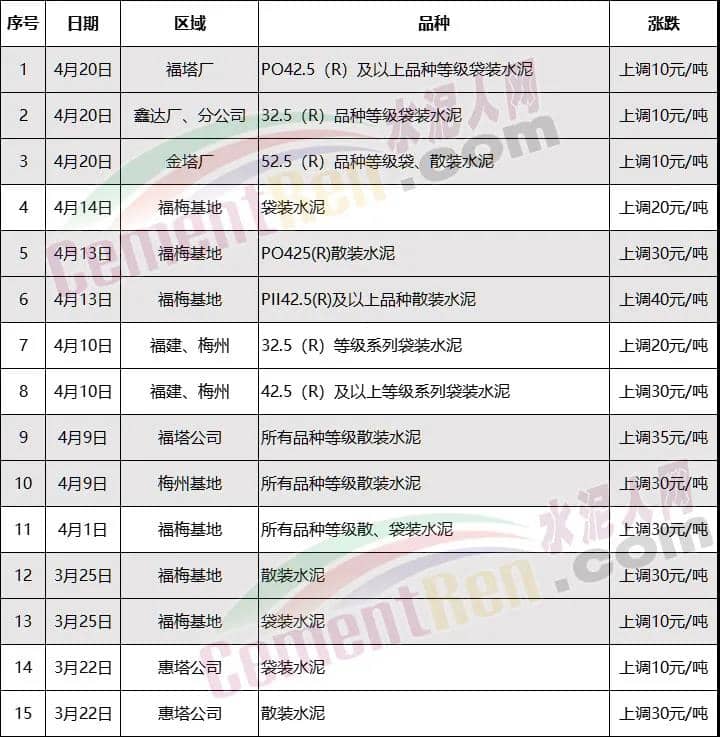 華南區(qū)域主要品牌企業(yè)廣東鴻豐水泥、惠州光大水泥、蕉嶺縣龍騰旋窯水泥、塔牌水泥等通知,20日起再次上調(diào)各標(biāo)號(hào)水泥價(jià)格10-30元/噸。
