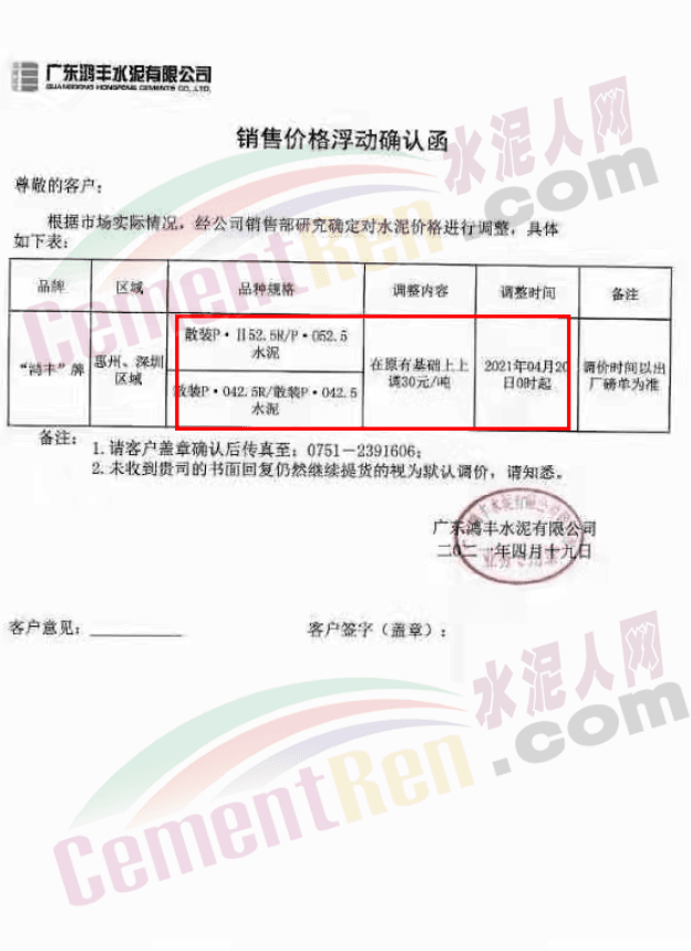 廣東鴻豐水泥有限公司通知自4月20日零時(shí)起,惠州、深圳區(qū)域P.II52.5R/P.O52.5和P.O42.5R/P.O42.5散裝水泥在原有基礎(chǔ)上上調(diào)30元/噸。