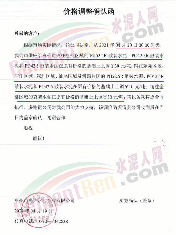惠州光大水泥通知:從4月20日0時(shí)起: