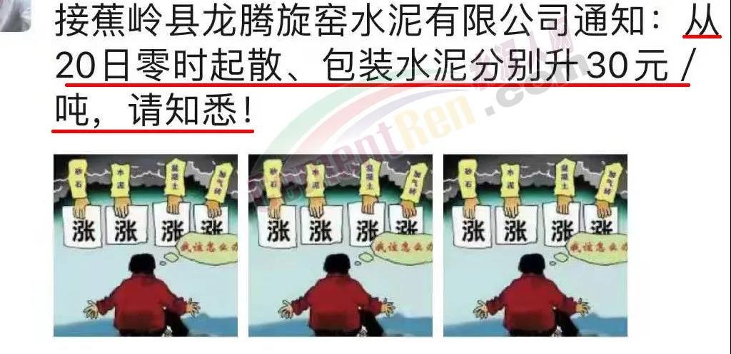 蕉嶺縣龍騰旋窯水泥有限公司通知∶20日零時(shí)起散、包裝水泥分別上調(diào)30元/噸。