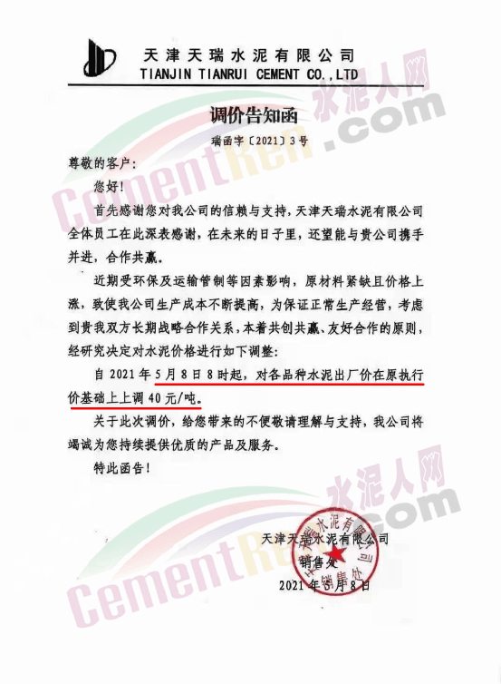 天津天瑞水泥有限公司通知,近期受環(huán)保及運(yùn)輸管制等因素影響,原材料緊缺且價(jià)格上漲,致使公司生產(chǎn)成本不斷提高,為保證正常生產(chǎn)經(jīng)營(yíng),經(jīng)研究決定自2021年5月8日8時(shí)起,對(duì)各品種水泥出廠價(jià)在原執(zhí)行價(jià)基礎(chǔ)上上調(diào) 40元/噸。