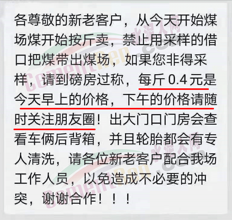 有煤場發(fā)消息稱:“各尊敬的新老客戶,從今天開始煤場煤開始按斤賣,禁止用采樣的借口把煤帶出煤場,如果您非得采樣,請到磅房過稱,每斤0.4元是今天早上的價(jià)格,下午的價(jià)格請隨時(shí)關(guān)注朋友圈!出大門口門房會查看車倆(輛)后背箱,并且輪胎都會有專人清洗,請各位新老客戶配合我場工作人員,以免造成不必要的沖突,謝謝合作!!”