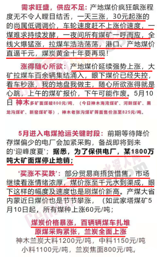 產(chǎn)地煤價(jià)瘋狂飆漲程度無不令人瞠目結(jié)舌,一天三漲,30元起的尚屬低調(diào)調(diào)價(jià),車輪速度趕不上漲價(jià)速度,一煤難求持續(xù)發(fā)酵,一夜間所有煤礦一呼而應(yīng),全線火爆猛漲,拉煤車浩浩蕩蕩,港口、產(chǎn)地煤直逼千元,煤炭黃金十年要再現(xiàn)!