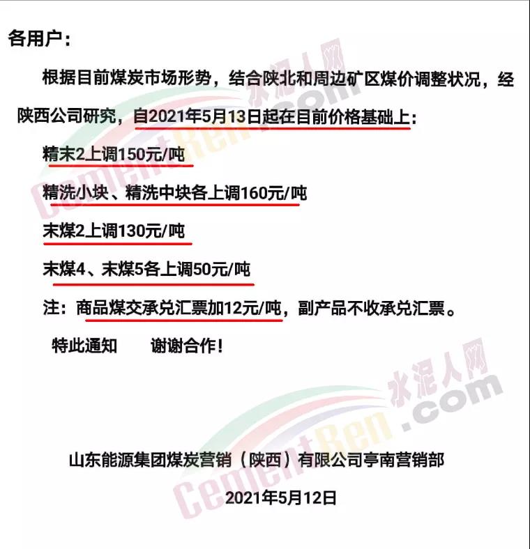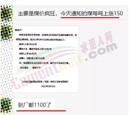 河南某水泥企業(yè)采購人員對水泥人網(wǎng)表示,12日收到通知,煤價(jià)再漲150元/噸,到廠價(jià)都1100元/噸了。