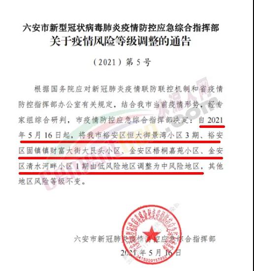 5月16日,安徽省六安市新型冠狀病毒肺炎疫情防控應急綜合指揮部發(fā)布《關于疫情風險等級調(diào)整的通告》稱,根據(jù)國務院應對新冠肺炎疫情聯(lián)防聯(lián)控機制和省疫情防控指揮部辦公室有關規(guī)定,結合六安市當前疫情形勢,經(jīng)專家組綜合研判,市疫情防控應急綜合指揮部決定∶自 2021年5月16日起,將六安市裕安區(qū)恒大御景灣小區(qū)3期、裕安區(qū)固鎮(zhèn)鎮(zhèn)財富大街大艮頭小區(qū)、金安區(qū)梧桐嘉苑小區(qū)、金安區(qū)清水河畔小區(qū)1期由低風險地區(qū)調(diào)整為中風險地區(qū),其他地區(qū)風險等級不變。